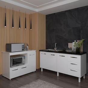 Balcão Cozinha Armário Gabinete De Pia 160 Cm Estela E Balcão Para Microondas E Forno Elétrico Lilian Branco Transforme sua cozinha com o Kit Balcão de Pia Estela 160 cm + Balcão para Microondas e Forno Lilian da Mobília Decor. O Balcão Estela é espaçoso e elegante, com puxadores cromados que trazem sofisticação ao ambiente, perfeito para quem precisa de amplo espaço de armazenamento. Já o Balcão Alana foi projetado para otimizar sua cozinha, com uma porta lateral ideal para utensílios maiores e duas portas inferiores, garantindo que tudo esteja organizado de forma prática e acessível. Perfeito para quem busca estilo e funcionalidade em um só conjunto!