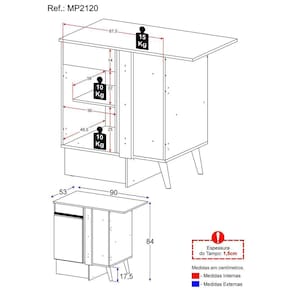 Dimensões do produto montado: Altura: 84cm | Largura: 90cm | Profundidade: 53cm (balcão com tampo) *Você pode consultar as medidas internas na imagem técnica do produto. *As cores do produto podem sofrer variações de tonalidade de acordo com as configurações do seu dispositivo.