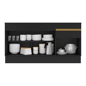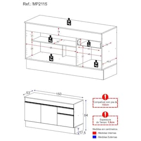 Dimensões do produto montado: Altura: 84cm | Largura: 150cm | Profundidade: 53cm (balcão com tampo) *Você pode consultar as medidas internas na imagem técnica do produto.
