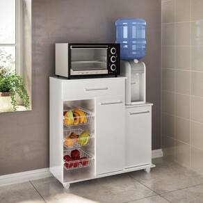 Sua cozinha vai ficar muito mais bonita e funcional com o Balcão Fruteira Multiuso Ditália. Alt-89,00 x Larg-89,,80 x Prof-33,00-Cm, Peso bruto 25,67 Kg - O tampos suportam até 15kg cada. O balcão possui duas portas e uma prateleira interna que suporta até 15 kg, possui uma gaveta com corrediça e três cestos/fruteiras metálicos em aramado, o produto possui também rodizíos que facilitam o deslocamento . Produto produzido em MDP 15mm e revestido em pintura UV atóxica, resitente moderno e funcional.