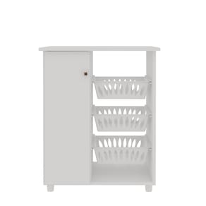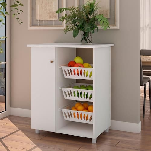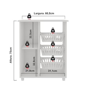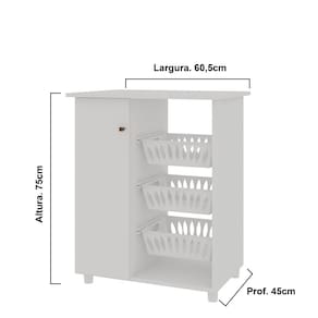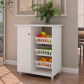 ESPECIFICAÇÕES - Produzido em MDP 15 mm - Fundo em lâmina de 2,5 mm - Puxador em plástico - Cestos para frutas em PVC - Pintura em UV branco brilho - Pezinhos em plástico - Dobradiças metálicas