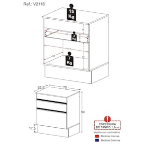Dimensões do produto montado: Altura: 84cm | Largura: 70cm | Profundidade: 53cm (balcão com tampo) *Você pode consultar as medidas internas na imagem técnica do produto.