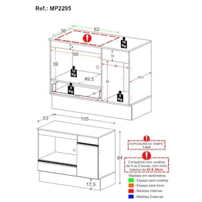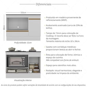 Possui tampo de 15mm para colocação de Cooktop de 4 ou 5 bocas e espaço exclusivo para acomodar o seu forno, otimizando o espaço da cozinha. O recorte do tampo deve ser feito no momento da montagem, conforme o tamanho do seu Cooktop (tamanho máximo do nicho: 62 x 36cm).