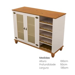 O balcao cristaleira adega baixa 2 portas Joy é uma peça que une funcionalidade e estilo em um único móvel. Estruturado em MDF resistente, ele recebe o toque especial do tampo, da base e dos pés em madeira de pinus, reforçando a rusticidade e a elegância natural da peça. As 2 portas com vidro espelhado conferem leveza e sofisticação ao design, enquanto o interior conta com 2 prateleiras, oferecendo espaço perfeito para organizar e exibir objetos com estilo. Ao lado, a adega possui 5 alturas, cada uma com 4 suportes para garrafas, ideal para armazenar suas bebidas de forma prática e organizada. As dobradiças são cuidadosamente acabadas, acrescentando ainda mais charme ao conjunto. Um móvel pensado para encantar, combinando robustez, beleza e personalidade em cada detalhe. Acabamento da Porta: Pintura UV Acabamento da Prateleira: Pintura UV Acabamento dos Pés: Verniz Altura dos Pés: 10,5 cm Altura Máxima dos Pés: 10.5000 Ambiente Principal: Sala de Jantar codigo_ean: 7900288244383 Complexidade da Montagem: Média: pode ser montado por mais de uma pessoa e/ou necessite de maior conhecimento para montagem Cor: Off White Cor da Porta: Off White Cor do Produto: Off White Cor dos Pés: Marrom Escala de Brilho: Semi-Brilho Escala de Brilho da Porta: Semi-Brilho Espessura do Vidro: 3 mm Itens Inclusos: 1 Balcão, Manual de Montagem e Ferragens. Linha ou Coleção: Joy Manual de Montagem e Instalação: https://product-hub-prd.madeiramadeira.com.br/383291516/documents/380aaeaf-ed29-4ecc-a7ad-bd6e1d77792d3239350543917588876340217.pdf Marca: Móveis Serpil Material da Porta: MDF Material da Prateleira: MDF Material Principal: MDF Necessita Montagem: Sim Origem do Produto: Nacional Peso: 58 kg Peso Máximo por Prateleira: 10 kg Porta Taças: Não Possui Adega: Sim Possui Espelho: Não Possui Gavetas: Não Possui iluminação: Não Possui Nicho: Não Possui Pés: 05 Possui Portas: Sim Possui Prateleiras: Sim Possui Vidro: Sim Quantidade de Garrafas da Adega: 10 ou mais Quantidade de Prateleiras: 06 Prateleiras Recomendações de Uso, Manutenção e Limpeza: Use um pano macio levemente umedecido. Não utilizar produtos abrasivos. Sapatas Niveladoras: Não Sistema de Montagem: Parafusos, Cavilhas, Minifix Suporta Até (kg): 10 kg Tipo de Dobradiça/Corrediça da Porta: Metálica Tipo de Porta: Abrir Tipo de Puxador da Porta: Externo