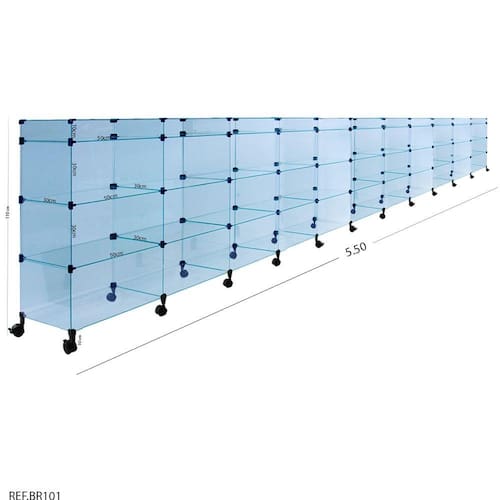 Balcão de Atendimento Modulado em vidro temperado de 4mm com bordas tratadas e 33 casuloss de 0,30 x 0,50 e 11 de 0,10 x 0,50. Balcão ideal para expor todos os tipos de produtos. Produto com rodízios articulados com travas, que garantem a praticidade de locomoção de seu produto com a segurança necessária para seu estabelecimento.