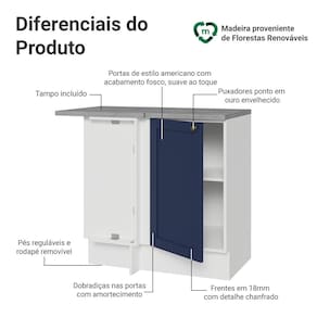 O acabamento de alta resistência da estrutura é em Branco e das portas em Azul. Possui uma textura suave ao toque, trazendo leveza e sofisticação ao ambiente. O destaque vai para os puxadores ponto em ouro envelhecido, feitos com metal resistente, que adicionam personalidade e um charme único. Outro diferencial está no detalhe chanfrado das frentes, que forma molduras elegantes e dá profundidade ao design, refletindo o estilo americano com um toque moderno.