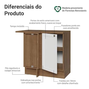 O acabamento de alta resistência da estrutura é em amadeirado Rustic e das portas em Branco. Possui uma textura suave ao toque, trazendo leveza e sofisticação ao ambiente. O destaque vai para os puxadores ponto em ouro envelhecido, feitos com metal resistente, que adicionam personalidade e um charme único. Outro diferencial está no detalhe chanfrado das frentes, que forma molduras elegantes e dá profundidade ao design, refletindo o estilo americano com um toque moderno.