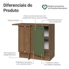 O acabamento de alta resistência da estrutura é em amadeirado Rustic e das portas em Verde. Possui uma textura suave ao toque, trazendo leveza e sofisticação ao ambiente. O destaque vai para os puxadores ponto em ouro envelhecido, feitos com metal resistente, que adicionam personalidade e um charme único. Outro diferencial está no detalhe chanfrado das frentes, que forma molduras elegantes e dá profundidade ao design, refletindo o estilo americano com um toque moderno.