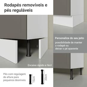 O acabamento de alta resistência da estrutura é em Branco e das portas em Cinza. Possui uma textura suave ao toque, trazendo leveza e sofisticação ao ambiente. O destaque fica por conta dos puxadores ponto em ouro envelhecido, feitos com metal resistente, trazem personalidade e um charme único. Outro diferencial está no detalhe chanfrado das frentes, que forma molduras elegantes e dá profundidade ao design, refletindo o estilo americano com um toque moderno.