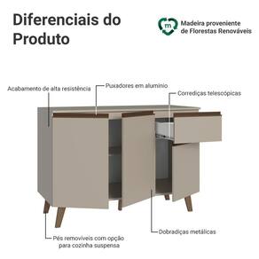 Produzido com materiais de qualidade, o balcão conta com dobradiças metálicas nas portas e puxadores em perfil de alumínio, discretos e resistentes. As gavetas possuem corrediças que permitem abertura total, oferecendo mais praticidade no uso diário. O tampo é removível, possibilitando a instalação de cuba ou pedra conforme o projeto e o acabamento de alta resistência mantém a beleza do móvel por muito mais tempo.