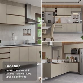 A linha Nice chega em uma nova versão no tom crema, uma tonalidade suave que transmite aconchego e leveza. Outro diferencial está nos puxadores em bronze metalizado que acrescenta um toque contemporâneo. Além disso, os móveis podem ser instalados de forma suspensa, ideal para facilitar a limpeza e tornar a rotina mais prática.