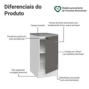 O acabamento de alta resistência da estrutura é em Branco e das portas em Cinza. Possui uma textura suave ao toque, trazendo leveza e sofisticação ao ambiente. O destaque fica por conta dos puxadores ponto em ouro envelhecido, feitos com metal resistente, trazem personalidade e um charme único. Outro diferencial está no detalhe chanfrado das frentes, que forma molduras elegantes e dá profundidade ao design, refletindo o estilo americano com um toque moderno.