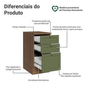COR: Verde | Garantia: 3 meses contra de fabricação | Dimensões - Altura: 84 cm | Dimensões - Largura: 40 cm | Dimensões - Profundidade: 52 cm | Produto: Cozinha | Marca: Madesa | Peso do Produto: 25 kg | Material: MDP | RBN: Casa/Móveis/Móveis de Cozinha | Estado de Origem: RS | Material para Filtro: MDP | Conteúdo da embalagem: 1 Balcão de Cozinha | Instruções/Cuidados: Utilize um pano limpo, levemente umedecido e seque em seguida a superfície. Não usar produtos químicos ou abrasivos para a limpeza. Recomendamos polir seu móvel com lustra-móveis duas a três vezes por ano. | Quantidade de gavetas: 3 | Quantidade de portas: 0 | Produto precisa de Montagem?: Sim, sugerimos a contratação do nosso de montagem (para os CEPs em que o está disponível) ou de algum experiente de sua preferência | Inclui tampo: Sim | Altura do Produto com Embalagem (cm): 20,6 | Largura Produto Com Embalagem (cm): 51,1 | Comprimento Produto Com Embalagem (cm): 70,3 | Peso Produto Com Embalagem (Kg): 24,96 | Dimensões do item P x L x A (item_depth_width_height): depth#value=52;depth#unit=centimeters;height#value=84;height#unit=centimeters;width#value=40;width#unit=centimeters | Nome do Simples no Fornecedor: Balcão de Cozinha 40 cm 3 Gavetas Rustic/Verde Vik Madesa | Fabricante: Madesa | Tipo de móveis de cozinha: Balcão | Linha: Vik | Materiais do corpo: MDP | Materiais das portas: MDP | Quantidade de caixas de embalagem: 2 | Bullet Point 0: Dimensões: 84 cm altura x 40 cm largura x 52 cm profundidade | Bullet Point 1: Inspiração no estilo americano, frentes com acabamento chanfrado e textura fosca suave ao toque | Bullet Point 2: Puxadores ponto em ouro envelhecido e gavetas que abrem totalmente | Bullet Point 3: A combinação perfeita entre design clássico e elementos modernos | É Frágil: Não | Quantidade de Itens: 1 | Certificação de teste externa: Sim | Modelo: G24401M3VK | Precisa de baterias ou pilhas: Não | da peça: G24401M3VK | Componetes Incluidos: Portas | Preço sugerido sem impostos: | Peso do Item: ;unit=kilograms | Descrição do Tamanho: 84 cm x 40 cm x 52 cm | Inclui manual de montagem: Sim Cor: Rustic/Verde