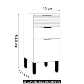 Esse Balcão conta com uma porta com dobradiças metálicas com amortecedor e puxadores em poliestireno, que garantem um fechamento sem impactos. As duas gavetas possuem corrediças telescópicas, proporcionando suavidade no uso e acesso total ao conteúdo interno. O Balcão de Cozinha é fabricado em MDP 15mm e apresenta acabamento em pintura fosca texturizada na estrutura e acetinada na porta e nas gavetas, com secagem realizada por luzes UV, que conferem um toque sofisticado e um visual moderno. Os pés, também em poliestireno, são reguláveis, permitindo ajustar pequenos desníveis de piso e manter a estabilidade do produto.