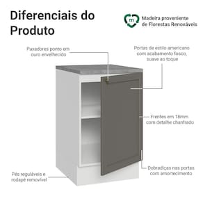 O acabamento de alta resistência da estrutura é em Branco e da porta em Cinza. Possui uma textura suave ao toque, trazendo leveza e sofisticação ao ambiente. O destaque fica por conta do puxador ponto em ouro envelhecido, feito com metal resistente, traz personalidade e um charme único. Outro diferencial está no detalhe chanfrado das frentes, que forma molduras elegantes e dá profundidade ao design, refletindo o estilo americano com um toque moderno.