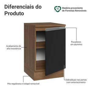 A porta possui dobradiças com amortecimento, garantindo um fechamento suave e silencioso. Possui pés reguláveis e o rodapé removível facilita a limpeza. O espaço interno é ótimo para organizar utensílios, panelas ou produtos de uso frequente.