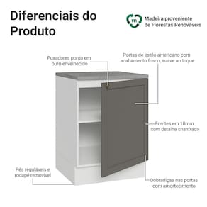 O acabamento de alta resistência da estrutura é em Branco e das portas em Cinza. Possui uma textura suave ao toque, trazendo leveza e sofisticação ao ambiente. O destaque fica por conta dos puxadores ponto em ouro envelhecido, feitos com metal resistente, trazem personalidade e um charme único. Outro diferencial está no detalhe chanfrado das frentes, que forma molduras elegantes e dá profundidade ao design, refletindo o estilo americano com um toque moderno.