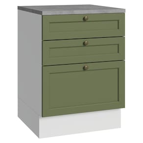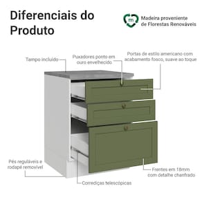 O acabamento de alta resistência da estrutura é em Branco e das gavetas em Verde. Possui uma textura suave ao toque, trazendo leveza e sofisticação ao ambiente. O destaque fica por conta dos puxadores ponto em ouro envelhecido, feitos com metal resistente, trazem personalidade e um charme único. Outro diferencial está no detalhe chanfrado das frentes, que forma molduras elegantes e dá profundidade ao design, refletindo o estilo americano com um toque moderno.