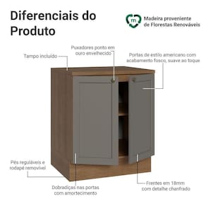 O acabamento de alta resistência da estrutura é em amadeirado Rustic e das portas em Cinza. Possui uma textura suave ao toque, trazendo leveza e sofisticação ao ambiente. O destaque fica por conta dos puxadores ponto em ouro envelhecido, feitos com metal resistente, trazem personalidade e um charme único. Outro diferencial está no detalhe chanfrado das frentes, que forma molduras elegantes e dá profundidade ao design, refletindo o estilo americano com um toque moderno.