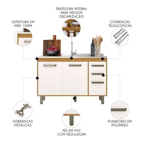 O Balcão de Cozinha possui três portas com dobradiças metálicas reforçadas, que proporcionam um movimento suave. As duas gavetas com corrediças telescópicas, permitem abertura total, facilitando o acesso aos itens. Os puxadores em polímero completam o visual com um toque charmoso. A Pia Inox se destaca pelo excelente desempenho no escoamento da água, além de oferecer uma superfície ideal para apoiar diversos objetos e auxiliar no preparo dos alimentos.