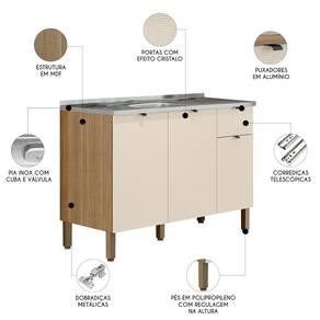 Produzido em MDF de 12mm com acabamento em pintura UV, o Balcão Para Pia garante durabilidade e resistência para o uso. As dobradiças metálicas e as corrediças telescópicas promovem uma abertura e fechamento suave, enquanto os puxadores em alumínio tornam o manuseio mais prático e confortável. Além disso, os pés em plástico resistente são reguláveis, o que permite ajustar pequenos desníveis de piso e manter a estabilidade do produto.