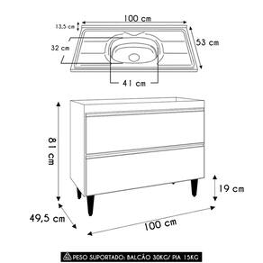 Dimensões dos Produtos (L x A x P) Balcão: 100 cm x 81 cm x 49,5 cm. Pia: 100 cm x 13 cm x 53 cm. Peso: 33 Kg.