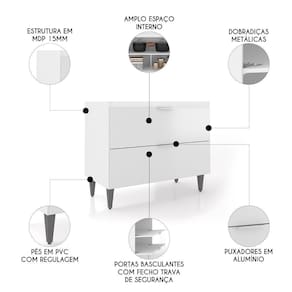 O Balcão Gabinete dispõe de duas portas basculantes com dobradiças metálicas e fecho trava de , que permite o fechamento com um simples toque. Também se destaca pelos puxadores em alumínio, agregando sofisticação e elegância ao ambiente. Possui estrutura em MDP 15mm, com acabamento em BP, e garante maior resistência no uso diário. Com amplo espaço interno, o Balcão de Cozinha oferece três divisões para organizar mantimentos, panelas e utensílios. A Pia Inox conta com um design ideal, que tem excelente desempenho no escoamento da água e possibilita o uso de diferentes objetos sobre ela. Os pés em PVC, são reguláveis, permitindo ajustar pequenos desníveis de piso e manter a estabilidade do produto.