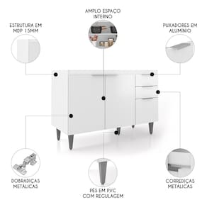 Dispõe de três portas com dobradiças metálicas, que proporcionam uma abertura suave, além de duas gavetas com corrediças metálicas. O Balcão Gabinete também se destaca pelos puxadores em alumínio, que adicionam um toque de sofisticação e elegância ao ambiente. Sua estrutura em MDP 15mm, com acabamento em BP, garante maior resistência e durabilidade. O Balcão de Cozinha possui uma prateleira interna que é uma ótima solução para organizar seus itens de maneira eficiente, acomodando mantimentos, panelas e outros utensílios. A Pia Inox conta com um design ideal, que tem excelente desempenho no escoamento da água e possibilita o uso de diferentes objetos sobre ela. Os pés em PVC, são reguláveis, permitindo ajustar pequenos desníveis de piso e manter a estabilidade do produto.