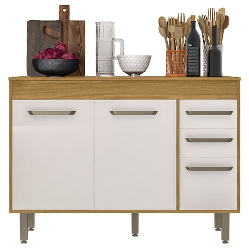O Balcão de Cozinha possui três portas com dobradiças metálicas reforçadas, que proporcionam um movimento suave. As duas gavetas com corrediças telescópicas, permitem abertura total, facilitando o acesso aos itens. Os puxadores em polímero completam o visual com um toque charmoso. O Tampo serve como apoio para eletrodomésticos e complementa o móvel com elegância.