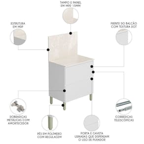 O Balcão de Cozinha Com Tampo 80cm 1 Porta Minsk Z06 Branco, da Mpozenato é para você que está buscando estilo e qualidade em um único produto. Produzido em MDP de 12 e 15mm, o Balcão Com Tampo conta com uma prateleira interna que otimiza o espaço. Sua textura cristalo deixa a peça ainda mais impecável permitindo combinações com diferentes estilos de decoração. A porta possui pistão a gás que proporciona uma abertura suave e controlada, além de maior segurança e comodidade no uso diário. Já as dobradiças metálicas com amortecedor permitem um fechamento sem impactos, prolongando a vida útil do movimento. As corrediças telescópicas possibilitam acesso total à gaveta. O Balcão de Cozinha pode ser utilizado de duas formas, como balcão com tampo ou balcão para cooktop de 4 e 5 bocas, nesse caso deve ser feito o recorte de acordo com o tamanho do seu eletrodoméstico. O acabamento em pintura UV garante maior resistência ao desgaste, mantendo o móvel com aparência de por muito mais tempo. Os pés são reguláveis, perfeitos para corrigir pequenos desníveis de piso. Excelente para deixar sua Cozinha mais bonita e organizada! Não dá para perder, né? Adicione ao carrinho e leve agora mesmo! Especificações Dimensões dos Produtos (L x A x P)Balcão: 80 cm x 90 cm x 51,8 cm. Tampo com Painel: 80 cm x 52,5 cm x 53 cm. Peso: 33 Kg. Características do ProdutoMaterial da Estrutura: MDP 12mm/15mm. Material do Fundo: HDF 3mm. Peso Suportado: 32 Kg distribuídos. Acompanha Tampo com Painel: Sim. Acabamento: Pintura UV. Escala de Brilho: Acetinado/Fosco. Quantidade de Portas: 1 Porta. Material da Porta: MDP 15mm. Tipo de Porta: Basculante. Material das Dobradiças: Metálicas. Possui Pistão a Gás: Sim. Possui Gavetas: Sim. Quantidade de Gavetas: 1 Gaveta. Tipo das Corrediças: Telescópicas. Possui Prateleiras: Não. Possui Pés: Sim. Quantidade de Pés: 4 Pés. Material dos Pés: Plástico. Altura dos Pés: 17cm com regulagem. Diferenciais:- Design moderno. - Porta basculante. - Porta e gaveta usinadas que dispensam o uso de puxador. - Dobradiças com amortecedor. - Frente do balcão com textura cristalo. - Pés com regulagem de 17 à 19cm. Sistema de Montagem: Cavilhas/Parafusos. Manual de Montagem: Sim. Complexidade da Montagem: Baixa. Volumes: 2 Volumes. Conteúdo da Embalagem: 1 Balcão, 1 Tampo. do Fabricante: 90 dias contra defeito de fabricação. Montagem: Recomendamos que seja feita por um . Recomendação de Limpeza: Utilize pano úmido. Observações importantes:- Produto para uso residencial em ambiente interno, não devendo ficar exposto diretamente ao sol, calor e umidades excessivas.- Pode haver alguma diferença de tonalidade entre a imagem e o produto real, por conta do tratamento de imagens e a calibração de cores do seu monitor.- As imagens são meramente ilustrativas, não acompanham objetos de decoração e eletrônicos.- Confira o estado da embalagem, não devendo assinar o comprovante em caso de danos.- Não asseguramos, no ato da , por subir escadas/elevadores, pelo transporte por guincho em apartamentos ou montagem, desmontagem e instalações. Eventuais despesas são por conta do comprador.- Confira as dimensões do produto e certifique-se de que passará normalmente por supostos elevadores, portas, escadas e/ou corredores de sua residência.