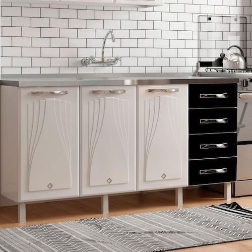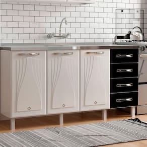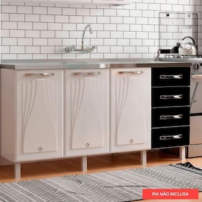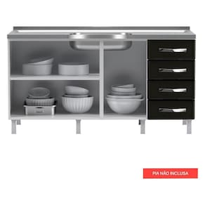 100% açoO Balcão de Cozinha de Aço Quádruplo sem Tampo para Pia 160cm Clara Multimóveis, para pia conta com três portas, quatro gavetas e um excelente espaço interno disponível para armazenar panelas e utensílios de maneira organizada em sua cozinha. Aqui, beleza e qualidade estão alinhadas para proporcionar mais funcionalidade: as gavetas são equipadas com corrediças metálicas, que abrem e fecham facilmente; sendo a parte interna da gaveta produzida integralmente em plástico rígido e durável, que comporta até 5kg de peso. Os puxadores e apliques resinados na cor Ônix são cheios de estilo e trazem mais brilho ao módulo. Fabricado em aço, este balcão para pia recebe pintura eletrostática e anticorrosiva, com acabamento brilhoso. O tratamento recebido na pintura garante resistência e durabilidade ao móvel.