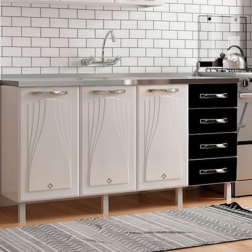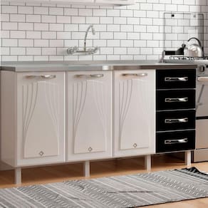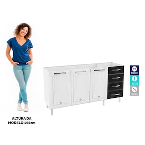 Informações Técnicas: Prateleira: 01 Gavetas: 04 Portas: 03 Cor: Branco/Preto brilhante Material: 100% aço Portas com design harmônico Puxadores e apliques na cor Ônix Corrediças metálicas Pintura eletrostática com preparo antiferrugem Pés com regulagem de altura Pia não inclusa