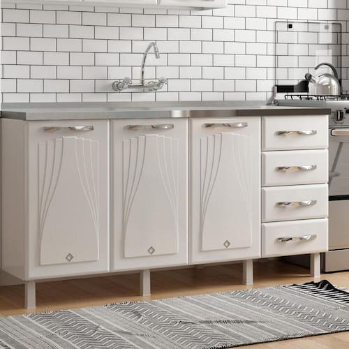 Informações Técnicas: Prateleira: 01 Gavetas: 04 Portas: 03 Cor: Branco brilhante Material: 100% aço Portas com design harmônico Puxadores e apliques na cor Ônix Corrediças metálicas Pintura eletrostática com preparo antiferrugem Pés com regulagem de altura Pia não inclusa
