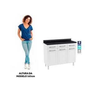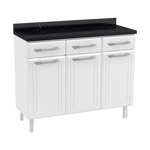 Informações Técnicas: Puxador: Plástico Número de Portas: 3 Tampo: Sim, preto Material do Tampo: MDP com acabamento em BP Número de Gavetas: 3 Quantidade de Prateleiras: 1 Cor: Branco Brilhante Pés: Sim