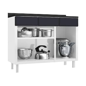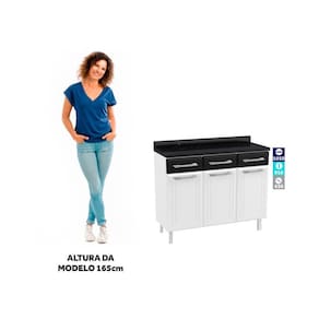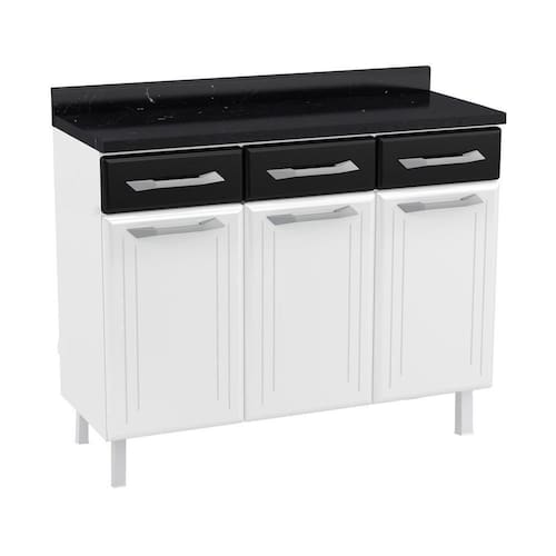 Informações Técnicas: Puxador: Plástico Número de Portas: 3 Tampo: Sim Material do Tampo: MDP com acabamento em BP Número de Gavetas: 3 Quantidade de Prateleiras: 1 Cor: Branco/Preto Brilhante Pés: Sim