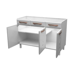 O Balcão de Cozinha de Aço Triplo sem Tampo para Pia 120cm Regina Multimóveis, conta com um amplo espaço disponível para armazenar panelas e utensílios de maneira organizada em sua cozinha. Ele possui duas gavetas equipadas com corrediças metálicas, que abrem e fecham facilmente, além de uma frente falsa para pia. A parte interna da gaveta é produzida em plástico rígido e durável, que comporta até 5kg de peso. Os puxadores e apliques resinados na cor Cobre Fosco dão um ar sofisticado para a peça. Fabricado em aço, este balcão recebe pintura eletrostática e anticorrosiva, com acabamento brilhoso. O tratamento recebido na pintura garante resistência e durabilidade ao móvel.