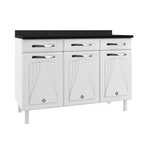 O Balcão Triplo de aço Star New é aquele móvel funcional que todo mundo em sonha ter em casa. É perfeito para a acomodação de louças, panelas e eletros, além de ser uma peça coringa no visual da cozinha: com a qualidade reconhecida da marca Telasul e a beleza da estampa Star New uma linha que é sucesso garantido. Gravado em alto relevo, o desenho proporciona um lindo efeito combinado com aplicações alto brilho em resina e com puxadores na cor ônix. O balcão conta com três gavetas fabricadas em polipropileno, um plástico rígido e lavável, que suporta até 5Kg de peso. Produzido todo em aço, passa por um rígido processo de pintura eletrostática e anticorrosiva, que garante proteção e resistência. A linha Star New é perfeita para cozinhas com personalidade.