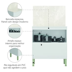 O Balcão Duplo Art é ideal para quem procura um produto prático e funcional. Conta com 1 gavetas com corrediças telescópicas e 1 porta basculante que dispõe de um amplo espaço para guardar o que precisar, com tampo e painel com detalhes em mármore e pés reguláveis de material resistente que não agridem o piso, garantindo firmeza e resistência ao móvel, trazendo um design mais moderno para sua cozinha.