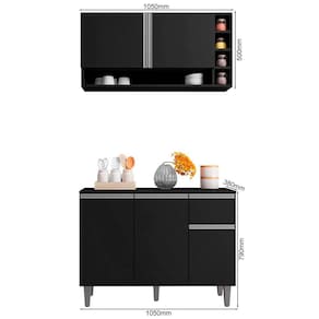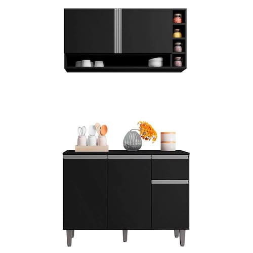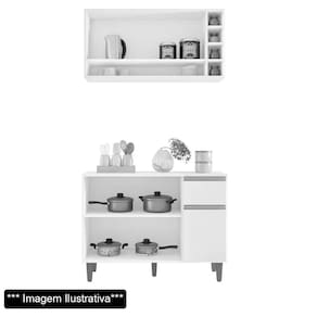 Pensando em praticidade e funcionalidade, o Balcão de cozinha possui um tampo para deixar seus utensílios e eletrodomésticos sempre a vista, conta também com 3 portas, 1 prateleira, pés em PVC e 1 gaveta com corrediças metálicas, perfeitos para guardar seus talheres, panelas e mantimentos. Já o Armário suspenso possui 2 portas, 1 prateleira e 1 nicho com 4 repartições para guardar temperos, potes, pratos e tudo o que precisar. Ambos os móveis, são produzidos 100% em MDP, acabamento em pintura UV, puxadores embutidos e dobradiças metálicas, garantindo resistência e durabilidade aos produtos.