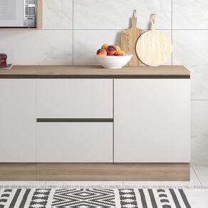 Os puxadores perfil em polímero adicionam um toque sofisticado e combinam com diversos estilos de decoração. Versátil, o Balcão pode ser montado com a porta para o lado esquerdo ou direito, se adaptando à disposição da sua cozinha. O tampo serve como apoio para eletrodomésticos e complementa o móvel com elegância.