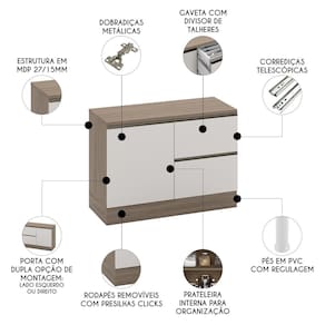 Conta com uma porta com dobradiças metálicas reforçadas, que proporcionam um movimento suave, além de duas gavetas externas e uma interna com divisor de talheres. As corrediças telescópicas permitem uma abertura total, facilitando o acesso aos itens armazenados.