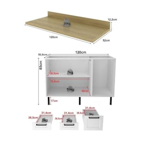 O balcão acompanha tampo removível 30mm em BP que suporta até 20kg e é com pia de 120cm, oferecendo diferentes opções de utilização. Possui 2 portas com dobradiças com amortecedor Slow Motion, além de 3 gavetas com corrediças telescópicas que deslizam suavemente e permitem acesso total, proporcionando máxima funcionalidade. , o balcão pode ser montado com as gavetas no lado esquerdo ou direito, conforme sua preferência.