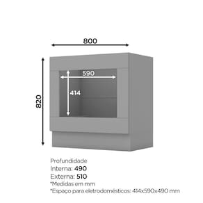 FICHA TECNICA: Acabamento: Pintura UV Texturizada Cor Interna: Na versao Branco e Trama Branco e na versao Cinza e Trama Escala de Brilho: Fosco Qtd. Portas: Nao possui Qtd. Gavetas: Nao possui Qtd. Prateleiras: Nao Possui Qtd. Pes: Possui rodape Material Pes/Rodape: MDF Pes Regulaveis: Nao Altura Pes/Rodapes: 14,5 Possui espaco para Quantos Fornos: 01 Forno Acompanha Tampo: Nao Medidas do Espaco para Forno: (A x L x P) 41,4 X 59 X 49 Cm Possui vidro: Nao Material Principal: MDF Material do Fundo: MDF Pode ser montado suspenso: Sim Produto Suporta ate (Kg): 80 Kg Peso Produto Montado (Kg): 21 Kg Medidas Montado: (A x L x P) 82 x 80 x 53,5 Cm