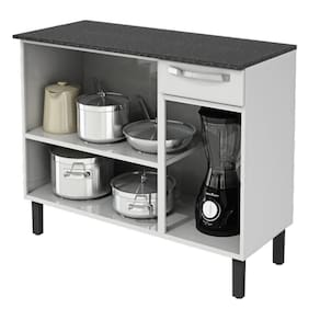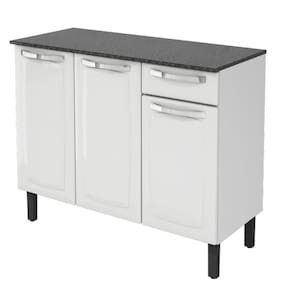 O Balcão possui 3 Portas e 1 Gaveta com espaço ideal para guardar mantimentos, panelas, potes, utensílios outros objetos que são essenciais no preparo de suas receitas.