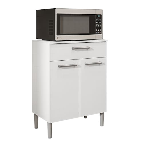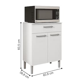 O Balcão é produzido em MDP, com madeira reconstituída, que respeita o meio ambiente. Composto de duas portas e uma gaveta onde são utilizadas dobradiças e corrediças 100% metálicas, acompanha tampo que pode ser utilizado como bancada para eletro portáteis ou outros utensílios. Os puxadores são ergonômicos em plástico resistente (poliestireno) e acabamento em cinza metalizado. Possui quatro pés fixos em plástico resistente (polipropileno) que garantem a estabilidade do produto. Todos processos com secagem em luzes UV que facilita a limpeza e conservação do produto.