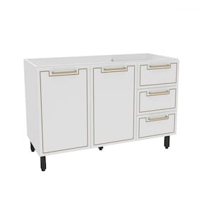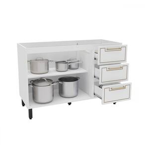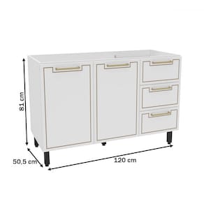 O(a) Balcão de Cozinha para Pia Amara 2 Portas 3 Gavetas Branco - Politorno é produzido em MDF e MDP na escala de brilho Semi-Fosco, e possui um grau de dificuldade de montagem: Médio.