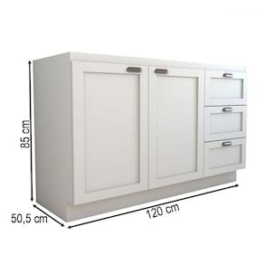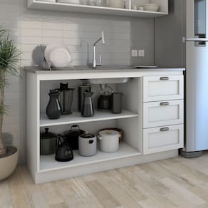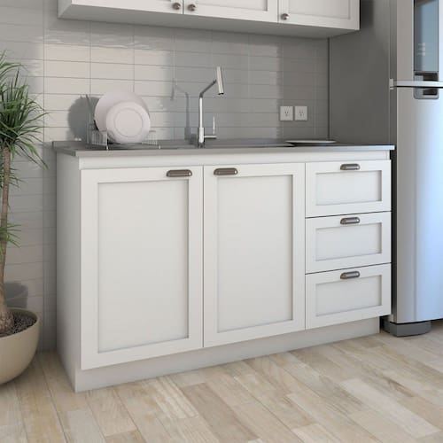 O(a) Balcão de Cozinha para Pia Essenza 2 Portas 3 Gavetas 100% Mdf Branco Fosco - Loja é produzido em 100% MDF na escala de brilho Fosco, e possui um grau de dificuldade de montagem: Médio.