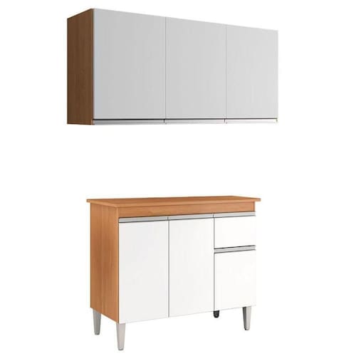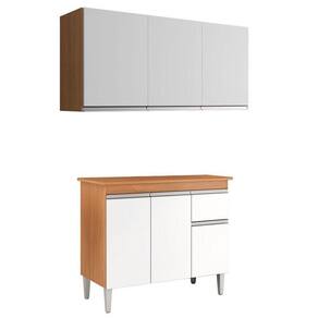 Balcão de Cozinha Tatiane com Tampo 100cm e Armário Aéreo Andréia 3 Portas Amêndoa Branco - AJL