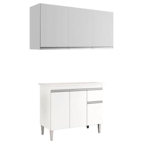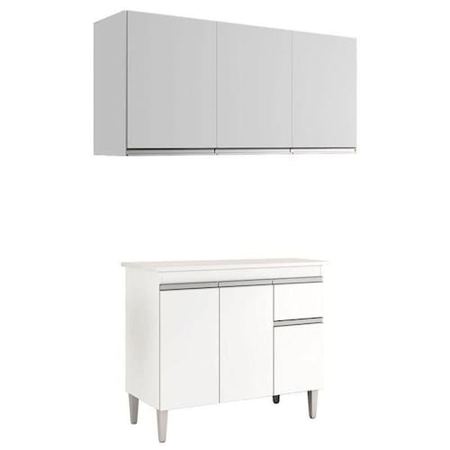 Balcão de Cozinha Tatiane com Tampo 100cm e Armário Aéreo Andréia 3 Portas Branco Brilho - AJL