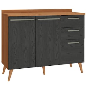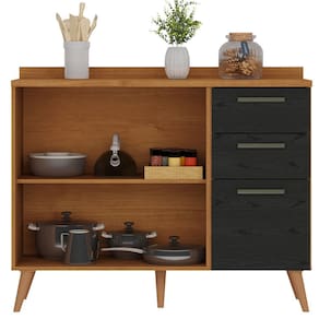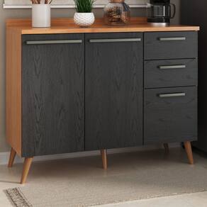 Estrutura: MDP com espessura de 15 mmAcabamento: Pintura U.V texturizado resistente de fino acabamentoPorta: Sim, 02 portas de abrir com dobradiças metálicas de 35 mmGaveta: Sim, 03 gavetas com corrediças telescópicas, sendo uma com gaveta com tamanho maior (gavetão), suporta o peso de ate 3 kg.Prateleira: Sim, prateleiras para melhor organizaçãoPuxadores: Sim, em PVCPés: Sim, 05 pés de em PVC, estilo palito retrô, maior durabilidade e segurançaDiferencial: Design elegante e sofisticadoDimensões do produto Montado
